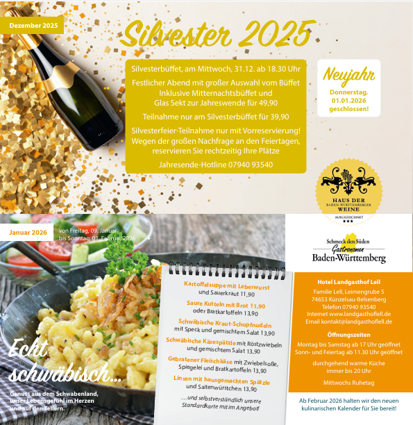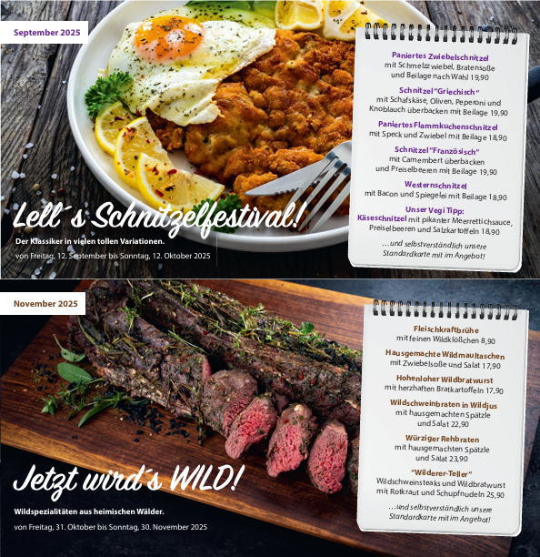 Im Landgasthof Lell erwarten Sie kulinarische Köstlichkeiten und herzliche Gastfreundschaft in einem gemütlichen Ambiente. Unser familiengeführtes Restaurant empfängt Sie täglich ab 17 Uhr, an Sonn- und Feiertagen bereits ab 11:30-20:30 Uhr, mittwochs gönnen wir uns eine kleine Verschnaufpause. Genießen Sie eine kulinarische Auszeit und erleben Sie die Aromen Hohenlohes in ihrer besten Form.