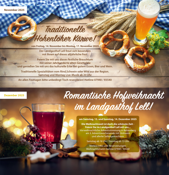 Der Landgasthof Lell, im malerischen Hohenlohekreis gelegen, freut sich auf Ihren Besuch. Unser familiengeführtes Haus in Belsenberg nahe Künzelsau offeriert komfortable, kürzlich renovierte Gästezimmer und ein gemütliches Restaurant. Als idealer Ausgangspunkt am Kocher-Jagst-Radweg stehen wir der Romantischen Straße nahe – perfekt für Wander- und Radtouren.